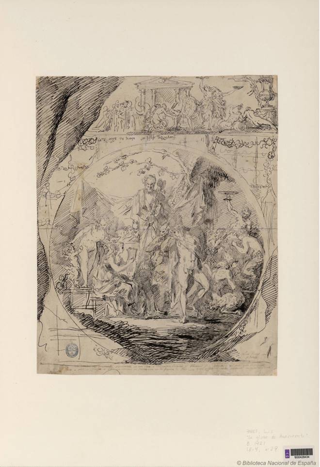 Goya não foi o único artista a experimentar ou utilizar técnicas não estritamente acadêmicas ou formais. Fato que pode ser visto em vários desenhos de Antonio Carnicero, por exemplo, em seus desenhos preparatórios ou de apontamentos para sua série de touradas, Colección de las principales suertes de una corrida de toros, onde usou várias vezes lápis de cor, também pena, lápis preto e tinta.16 Outro exemplo é o retrato da Rainha María Luisa de Parma (Fig. 4) feito com lápis de cor pelo mesmo artista, preservado agora na Biblioteca Nacional da Espanha, do qual existe, pelo menos, outra versão feita somente a lápis.17 Carnicero também usou o pincel com proficiência e habilidade, como evidenciam seus desenhos preparatórios para sua série de gravuras do Real Picadero (Fig. 5), onde conseguiu linhas muito finas, como Goya também fazia, alcançando uma grande variedade de nuances.18 Outro artista que mudava frequentemente de técnica foi Luís Paret y Alcázar, que usava tanto aguadas de cor para preparar suas obras finais, como também a pena, utilizada com grande habilidade, como se pode observar na La Gloria de Anacreonte, conservada na Biblioteca Nacional da Espanha (Fig. 6), ou nas aquarelas para sua famosa série de História Natural para o Infante Dom Luís. Paret também usou pincel, conseguindo traços muito finos nos desenhos preparatórios para ilustrações para o editor de livros Sancha, ou na preparação de algumas obras (Fig. 7).19
