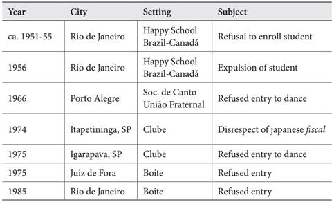 Based on a similar collection of newspaper accounts, the clippings collection of the Centro de Estudos Afro-Asiáticos in Rio de Janeiro and other sources, I have identified 23 outright legal cases (rather than complaints to the police or to the press) over discrimination that went to trial and in which a judge rendered a legal decision. Of these cases, 7 resulted in convictions or court orders mandating integration. Of these cases, two were described in the press as the first of their kind (they were from 1975 and 1985, so neither were).Twenty-one of the cases were brought under the 1951 law. The other two were brought as cases of desacato - disrespect of the authorities - and involved public officials who were of Japanese descent. Of these cases, one resulted in a conviction, and the other failed because of false testimony given by several witnesses.