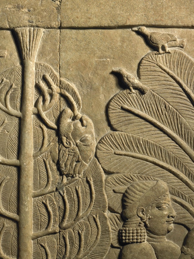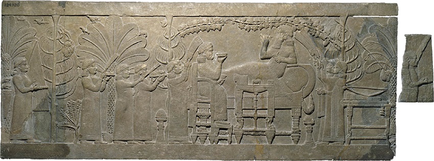 A cena é bem conhecida:1 o rei Assurbanipal (668-627 a.C.) está alongado em um leito finamente decorado; apoiado sobre o cotovelo esquerdo, segura em uma das mãos uma flor de lótus; na outra, uma taça. Diante dele, está sua rainha, sentada em uma poltrona elevada, com apoio para os pés. Ela segura um buquê de flores e leva aos lábios um cálice. Tudo se passa em um jardim ornado de palmeiras e abetos; uma parreira, regurgitando de cachos de uvas, emoldura o casal. Pequenos pássaros pousam nas árvores. Os soberanos são abanados e servidos com acepipes em bandejas. A música preenche o ambiente.2