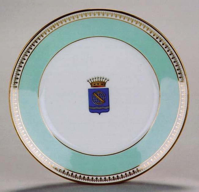 No momento de fazer as encomendas aos importadores, além de ser possível escolher, a partir de catálogos, a forma e a decoração desejadas, também havia a opção de solicitar a inclusão de monograma (com ou sem coroa), brasão ou outras opções, a cada uma delas correspondendo preços específicos.30 Foi por meio desse sistema que os titulares do Império brasileiro puderam personalizar suas louças. Veja-se, por exemplo, o prato que pertenceu ao Barão de Avellar e Almeida, acima citado, no qual se pode notar, entre os elementos decorativos, o seu monograma “AA” com a coroa de barão (figura 2).