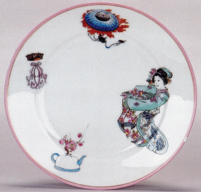 Fonte: Acervo do Museu Paulista da Universidade de São PauloRecentemente, Bracquemond foi redescoberto como artista atuante no movimento impressionista e, tanto quanto Émile Gallé, precursor do art-nouveau. Em Bracquemond, a inovação se dá sobretudo pela aplicação, pela adaptação à cerâmica, do conhecimento das artes gráficas que são a sua especialidade; é também das artes gráficas que ele traz a estética e os motivos japoneses (Bouillon; Meslin-Perrier, 2005). O período de 1872 a 1880, em que este artista dirige, para Haviland & Co, o “atelier d’Auteuil”, nos arredores de Paris, é considerado muito criativo e produtivo. Sob a direção geral de Charles Haviland, Bracquemond cria decorações ao mesmo tempo inovadoras e comercialmente bem-sucedidas. O Museu Paulista tem em seu acervo um prato de um serviço de sobremesa decorado com decalques16 em motivos japoneses,17 entre os quais uma “graça japonesa”, figura feminina com quimono, encontrada em uma prancha de Bracquemond (Bouillon; Meslin-Perrier, 2005).18 Esta peça mostra bem a distribuição mais solta dos elementos decorativos. Tem ainda um friso cercando a borda, mas este é estreito e tem a leveza de um cor-de-rosa suave (figura 2). Além disso, nesse havia uma variação na decoração de um prato e outro como se pode ver numa das páginas de um catálogo da manufatura Haviland datado de 1879, o que confere ainda mais modernidade a esse serviço.19