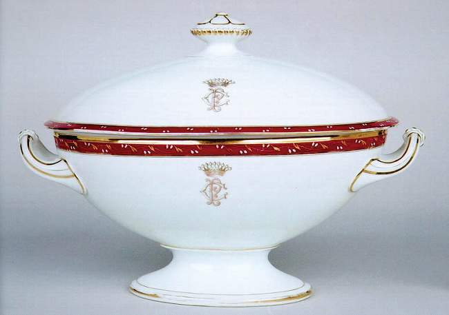 Para o transporte transatlântico, tudo havia sido acondicionado em nove barricas, sendo quatro delas para as porcelanas e cinco para os cristais. As porcelanas foram descritas como “aparelho para jantar feitio liso com pé, padrão Medicis, cor rubi e ouro com coroa de Conde e monograma CP, pintados, composição para 120 pessoas como acima mencionado.” Nas peças deste serviço existentes no acervo do Museu Paulista (figura 3), vê-se que são predominantemente brancas, com a maior parte das superfícies apenas revestidas por vitrificação (recobertas por esmalte incolor), que faz com que, no processo de fabricação, depois de a peça ser revestida e levada ao forno, o branco ganhe um aspecto mais liso, homogêneo e brilhante, sublinhando as características da porcelana. A cor designada como rubi foi usada para frisos que trazem um delicado motivo decorativo em brancos e dourados, que, segundo Dreyfus, representariam grãos de café. Esses frisos apresentam-se entre filetes dourados e as dourações encontram-se igualmente em detalhes dos pegadores, asas e pés, além de o ouro ter sido utilizado também para o monograma coroado (Dreyfus, 1982, p.307).