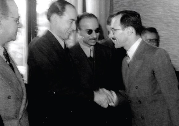 Para que ocorressem os eventos propostos pelos documentos mencionados, foram realizadas atividades no período do dia 20 a 28 de junho e do dia 01 a 11 de julho de 1942, perfazendo 20 dias de acontecimentos que movimentaram a sociedade local e nacional para tornar significativo e chamar a atenção do país para a filha mais moça10 do Brasil. As instituições envolvidas foram: Associação Brasileira de Educação; Conselho Nacional de Estatística; Conselho Nacional de Geografia, Instituto Brasileiro de Geografia e Estatística11 (e seus respectivos conselhos regionais) e o Ministério da Agricultura. O IBGE, por meio do seu Conselho Nacional de Geografia foi, como dissemos anteriormente, protagonista. Por exemplo, na figura 1 vê-se o Interventor de Goiás, Pedro Ludovico Teixeira (1891-1979), cumprimentando o geógrafo Fábio de Macedo Soares Guimarães (1906-1979), principal representante do IBGE em Goiás (Tavares, 2010).