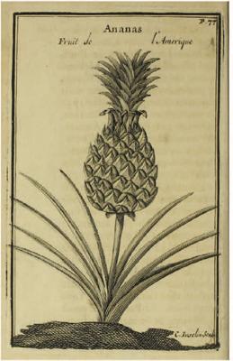 De todas las fórmulas o tópicos de los viajeros a América, la descripción que Froger hace del ananá o piña es, tal vez, la que con más fuerza remite a las imágenes provistas por los relatos “fundacionales” del Nuevo Mundo (BENITES, 2014). Tras mencionar lo bien que se han aclimatado las legumbres y frutas europeas y enumerar aquellas del Brasil, el joven francés señala: “el ananá crece como un alcaucil y se parece a una piña, sus hojas son largas y espesas, y contienen pequeñas espinas, porta una corona de las mismas hojas y es una de las mejores frutas de toda América”21 (FROGER, 1698, p. 77). Las imágenes textuales escogidas en esta comparación remiten a la definición dada por el pastor hugonote Jean de Léry en su Histoire d’un voyage faict en la terre du Brésil de 1578. Para Léry (1994, p. 224),