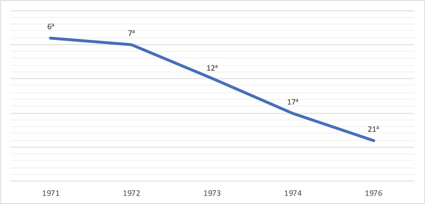 O gráfico foi feito com os dados da revista O Empreiteiro, que produzia anualmente uma lista das maiores empresas de engenharia brasileira contabilizando o faturamento. Como indicado, em 1964, a Rabello constava como uma das maiores construtoras do país. Apesar das perdas sentidas na segunda metade dos anos 1960, a empresa era ainda a sexta maior empreiteira brasileira em 1971. A partir dali, deu-se uma decadência contínua na primeira metade da década de 1970. Não possuímos dados de 1975 e, desde 1977, ela não figura mais no ranking.