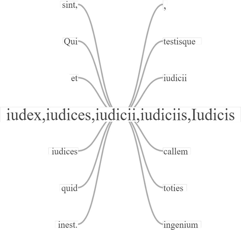Para verificar as palavras associadas à prática da corrupção no Contra Iudices, deve-se atentar, então, às descrições feitas por Teodulfo sobre o que ele entendia por isto. Um primeiro passo é verificar os termos mais associados à figura dos “juízes” no texto:30