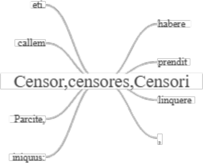De fato, vê-se que, tanto para o termo iudex (e suas derivações declinativas conforme demonstra a Figura 1) quanto para o termo censor (e suas derivações declinativas conforme demonstra a Figura 2), termo utilizado por Teodulfo para também fazer menção aos juízes,31 quase inexistem palavras que fazem menção direta à corrupção. A exceção é iniquus, no caso das ocorrências de censor, que pode ser traduzido para o português moderno como algo próximo a “injusto”. Ou seja, neste contexto, a figura mantenedora da justiça nos tribunais carolíngios do final do século VIII teria atrelada a si a ideia de injustiça. Ora, se não há quase menções diretas à corrupção no Poema 28, como analisar, então, este problema no texto? Para isto é preciso retornar ao documento.