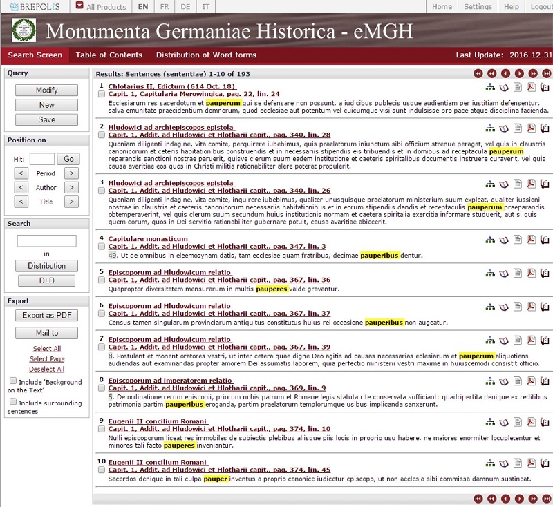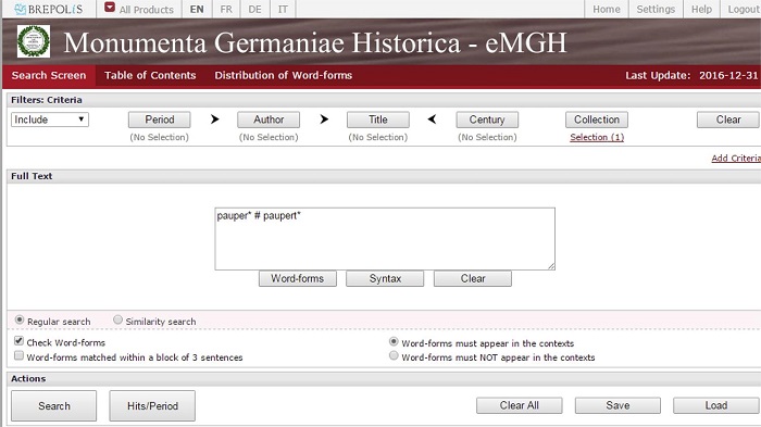 Estabelecidas as palavras de interesse, o próximo passo foi buscar os termos nos documentos. A ferramenta utilizada foi a Electronic Monumenta Germaniae Historica (eMGH). A eMGH é um mecanismo de busca online que procura e identifica itens, correspondentes a palavras-chave ou caracteres especificados pelo usuário, num banco de dados composto pelos documentos editados na coleção Monumenta Germaniae Historica (MGH). Ela é mantida pela editora Brepols e seu acesso é pago.