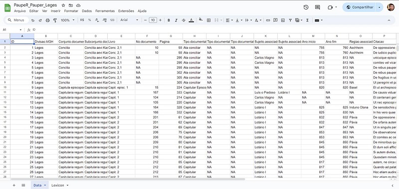 Na Figura 3 temos um screenshot do banco de dados que serviu de base tanto para a publicação na plataforma pública online quanto como referência para utilização no programa PaupeR (sobre o qual se falará mais adiante). O banco de dados em formato de planilha foi dividido em duas páginas: “Data”, onde estão codificados os dados da documentação obtidos através do motor de busca eMGH, e “Lexicon”, uma ferramenta desenvolvida que auxiliou no funcionamento do programa PaupeR. A página “Data” apresenta 16 colunas: ID, Divisão MGH, Conjunto documental, Subconjunto documental, Livro, Número do documento, Página, Tipo documental 1, Tipo documental 2, Tipo documental 3, Sujeito associado 1, Sujeito associado 2, Ano início, Ano fim, Região associada e Citação. Onde: