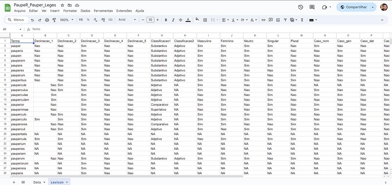 O “Lexicon”, demonstrado na Figura 4, foi dividido em 15 colunas: Termo, Declinação, Classificação 1, Classificação 2, Masculino, Feminino, Neutro, Singular, Plural, Caso nom., Caso gen., Caso dat., Caso ac., Caso abl., Caso voc., em que: