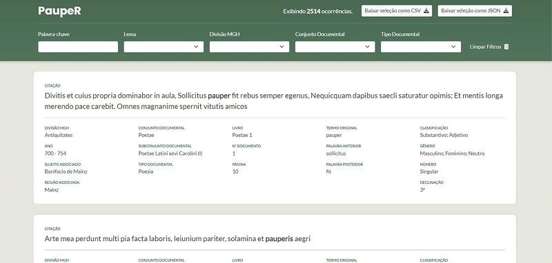 Esse banco abriga todos os dados gerados pela pesquisa, isto é, as 2.514 ocorrências concernentes aos termos-chave em língua latina da semântica da pobreza nos documentos medievais selecionados: pauper, egens, inops e mendicus. Uma vez que a navegação por todo esse volume de dados se mostraria difícil, optou-se por criar filtros, localizados na parte superior da página, que ajudam ao usuário a refinar sua busca. Eles operam de maneira independente ou articuladas entre si, e tomam como referência as categorias estabelecidas nas planilhas do banco de dados, à exceção de duas: “palavra-chave” e “lema”. “Palavra-chave” faz uma busca pelo termo exato escrito pelo usuário nos trechos documentais das ocorrências hospedadas no site. “Lema” busca por todas as ocorrências em que se encontram os termos-chave, independente da declinação utilizada (por exemplo, uma busca pelo lema “pauper” retorna as ocorrências das formas pauper, pauperum, pauperes, pauperibus e assim por diante). Infelizmente não foi possível incluir outros filtros por uma questão de espaço e funcionalidade da página.