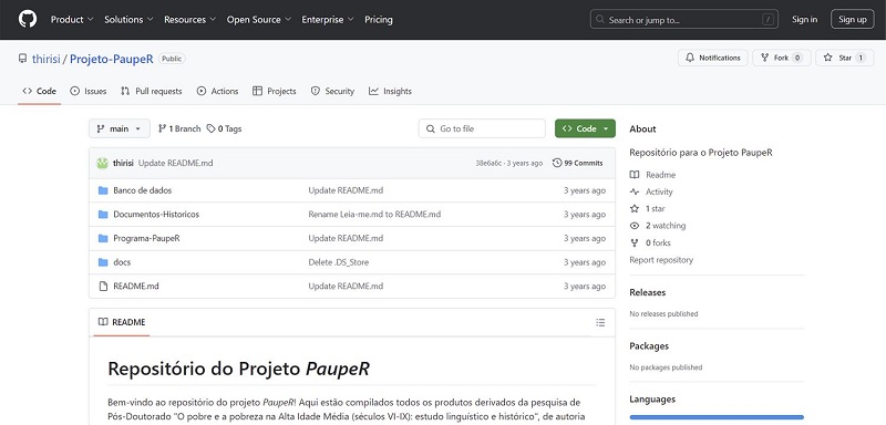 A segunda forma de publicação dos dados de modo público foi a criação de um repositório com essa finalidade no GitHub, uma plataforma de hospedagem de códigos-fonte e arquivos. Optou-se por essa solução por ela oferecer não só a possibilidade da hospedagem gratuita, mas funcionalidades de navegação não encontradas em outras plataformas, como as já citadas DMPTool, Zenodo ou mesmo drives virtuais de armazenamento em nuvem como Google Drive, Dropbox ou OneDrive. Destaca-se também, entre as funcionalidades oferecidas pelo GitHub, a possibilidade de outros usuários copiarem o conteúdo do repositório (através da opção “Fork” do site). O endereço eletrônico do repositório é: https://github.com/thirisi/Projeto-PaupeR, cuja página inicial é reproduzida abaixo: