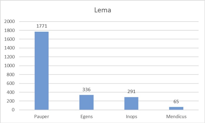 O levantamento dos dados passou pelo entendimento de que a linguagem é a instância de mediação para a compreensão da pobreza nos documentos dos séculos VI a IX. É na relação entre a linguagem e as representações que ela evoca que se situam a compreensão dos sentidos mobilizados pelos agentes históricos sob escrutínio. Dessa forma, o primeiro passo foi determinar o campo semântico do que se entende por “pobre” na documentação em análise. Esse termo, em língua portuguesa moderna, pode ser traduzido de diversas formas segundo os mais variados dicionários e léxicos de língua latina, linguagem na qual foi redigida a documentação (Friedemann; Koch, 1860; Gaffiot, 1981; Mollat, 1974, 1976; Ramshorn; Lieber, 1841). Definiu-se um conjunto de 191 palavras e expressões em latim que se relacionam, de alguma forma, ao tema do pobre e da pobreza no período referenciado. Além dos substantivos comuns (pauper, egens, inops, mendicus, miser e seus derivados como pauperrimus), palavras e/ou expressões como orph(f)anus, vidua, fames, dives, decima, solidus, oppressio, entre outras, também compõem o campo.