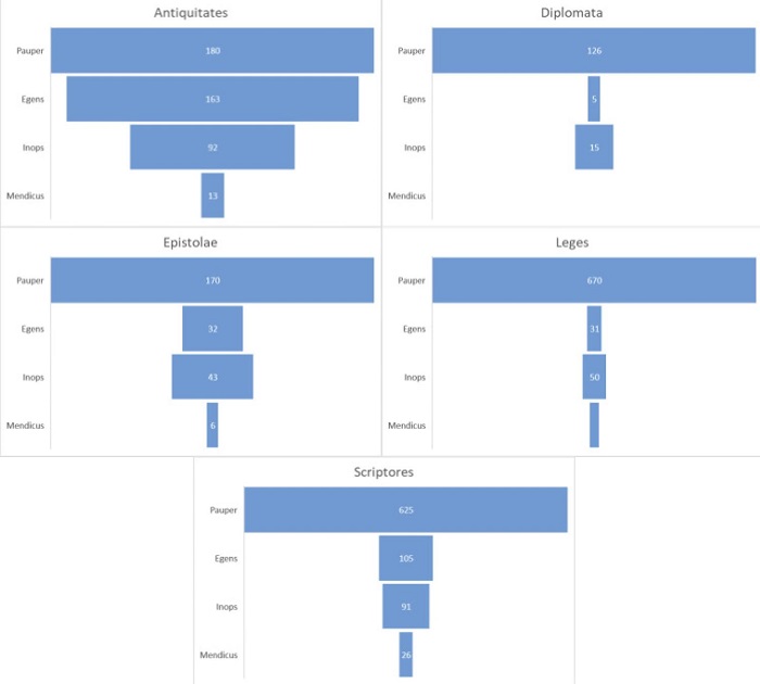 A distribuição dos termos também é outra questão que chama a atenção. A palavra-forma pauper é preponderante em todos os conjuntos documentais, com egens e inops se revezando como segundo ou terceiro colocados em número de ocorrências. No entanto, embora a palavra-forma egens seja a segunda mais frequente na documentação, somente na seção Antiquitates e Scriptores isso se confirma. Nas seções Diplomata, Epistolae e Leges, esse lugar é ocupado pela palavra-forma inops. A preponderância de inops em documentos de ordem normativa, como os conjuntos de leis e diplomas, representaria algum sentido específico? Já a preponderância de egens junto à seção Antiquitates, que abriga, entre outras coisas, os poemas dos tempos carolíngios e otonianos, representaria a presença dos modelos poéticos da Antiguidade, referência para as cortes carolíngia e otoniana?