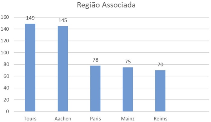 A Figura 11 apresenta um novo tipo de informação: a quantidade de ocorrências das palavras-forma por região associada. No último gráfico, que contém as cinco localidades mais citadas na documentação, fica clara a associação da frequência às regiões onde ocorreram concílios (por exemplo, os 5 concílios de 813) — com a observação de que os capitulares, textos normativos expedidos pelos príncipes francos (Silva, 2020), em algumas ocasiões estão associados também ao palácio de Aachen. Tours e Reims também merecem destaque, uma vez que são locais associados a dois prolíficos autores dos séculos VIII e IX: Alcuíno e Incmaro de Reims. Essa questão pode ser ainda mais aprofundada na figura seguinte.
