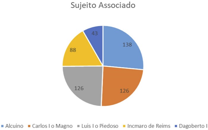Na Figura 12 apresentam-se as ocorrências das palavras-forma por sujeito associado, isto é, os sujeitos associados à elaboração do documento do qual foi tirada a ocorrência, quer seja seu autor, quer seja sob sua responsabilidade ou autoridade (por exemplo, um determinado rei ou bispo). Carlos Magno (r. 768 - 814) e Luís o Piedoso (r. 814 - 840) aparecem como as autoridades francas mais frequentemente associadas às ocorrências das palavras do campo semântico da pobreza. Mas, como frisado acerca do gráfico anterior (Figura 12), outros sujeitos destacam-se, como Alcuíno e Incmaro de Reims. Ou seja, para conhecer como os pobres e a pobreza eram entendidos nos séculos VIII e IX, é importante visitar as obras atribuídas aos dois autores. O rei merovíngio Dagoberto I (r. 629 - 634) destaca-se não só pela presença das palavras-forma em seus diplomas, mas também pela Gesta sobre esse rei.