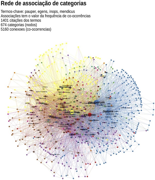 Os termos pauperum, pauperes, pauperibus, pauper e inopia estão entre as categorias mais bem conectadas, demonstrando que estão entre os termos mais utilizados na documentação. Também podemos observar que eles estão em comunidades diferentes, sugerindo que cada um deles tem sua própria “comunidade contextual”. Por exemplo, o termo pauperum tem grande associação com os tipos documentais “Diploma” e “Capitular” (comunidade azul na imagem 16), enquanto pauperibus (amarelo) está associado com o tipo documental “Narrativo”, pauper (marrom) com “Poesia” e inopia (roxo) com “Carta”. Esse mapeamento é útil para direcionar os esforços na compreensão da pobreza entre os séculos VI e IX, na medida em que direciona para certos tipos documentais o entendimento de termos específicos.