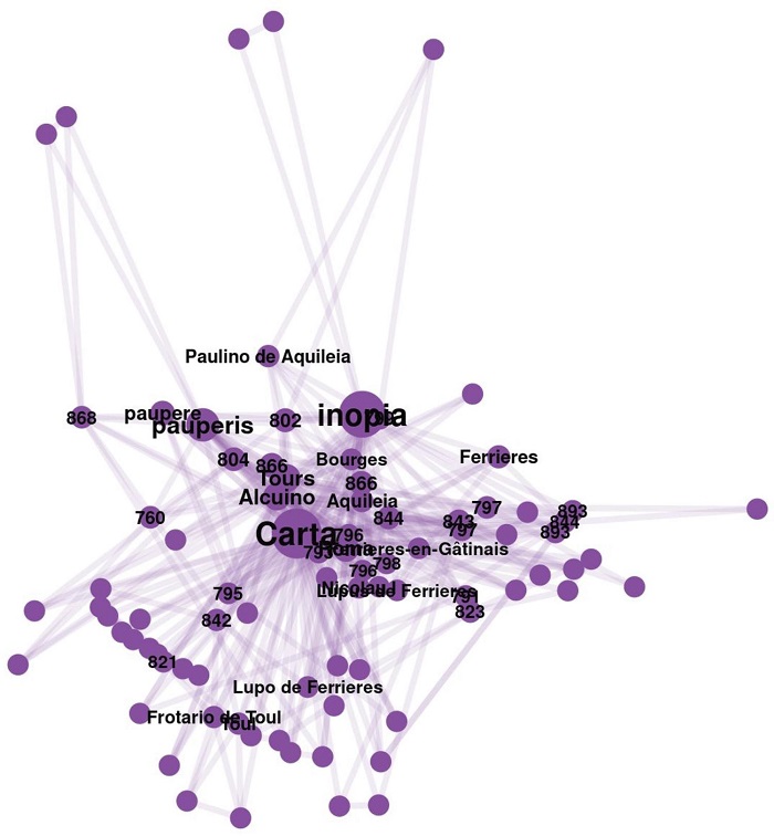 Essa rede, demonstrada na Figura 14 e cujo epicentro é o tipo documental “Carta”, demonstra as palavras-forma associadas a esse tipo documental e também sujeitos, anos e regiões associadas a ele. Vê-se que autores como Paulino de Aquileia, Lupo de Ferrières, Alcuíno e Frotário de Toul foram proeminentes no uso das palavras pauper, pauperis e inopia em suas missivas, demonstrando que têm profunda importância na reflexão sobre a pobreza no período recortado pela pesquisa desenvolvida. Tais exemplos estão longe de esgotar o tema. De fato, o material coletado abre caminhos de pesquisa a serem explorados por diversas iniciativas. Por exemplo: é possível que Teodulfo de Orleães (m. c. 820) tivesse um entendimento particular da pobreza em suas poesias? Como isso se compara aos seus outros escritos? E a outros autores contemporâneos, como Alcuíno?