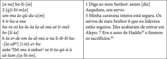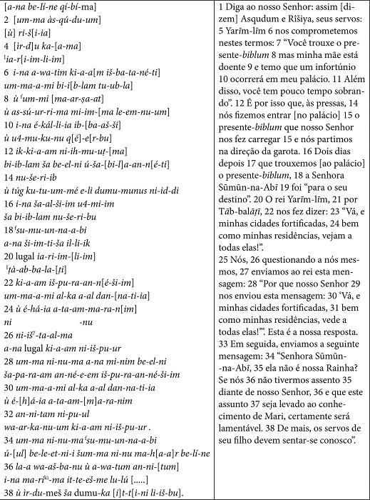 Meu senhor, me disse isso sobre Eshnunna: “Durante sua jornada rio acima, quando você se encontrar na presença de Yarim-lim, você falará com ele assim sobre Eshnunna: ‘[O rei de] Eshnunna não cessa de me enviar mensagens para um pacto de não agressão. Uma primeira vez, ele me enviou um mensageiro; mandei-o de volta para a própria fronteira. Ele me enviou uma segunda vez, e eu o enviei de volta para a própria fronteira. E, depois, um embaixador [râkib imêrim] veio e eu o enviei de volta para a própria fronteira, dizendo: Como, sem o consentimento de Yarim-lim, haveria um pacto de paz com Eshnunna[?]’”.19