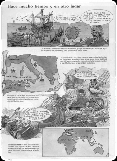 Analicemos un ejemplo incorporado al desarrollo curricular. De su lectura podemos inferir que el equipo de autores se propuso alterar los procedimientos discursivos convencionales para abordar el tema de los motivos generadores de los viajes de Cristóbal Colón. En este caso la transposición reúne numerosas características de adulteración de la historieta en su especificidad como género. Los relatos no tienen ningún criterio consistente en cuanto a continuidad y discontinuidad narrativa y acerca de marcas que orienten al lector. Tampoco eligen aquellos aspectos de la historia que justifiquen el empleo de esa composición con identidad: se han mezclado sin criterio hechos desencadenantes de la preocupación por nuevas rutas pero sin ningún papel en la trama; se han yuxtapuesto momentos de acción con explicaciones de motivos en una misma escena; han sido adulteradas en esa decisión las estrategias de elección y articulación de planos que producen efectos de sentido dramáticos.