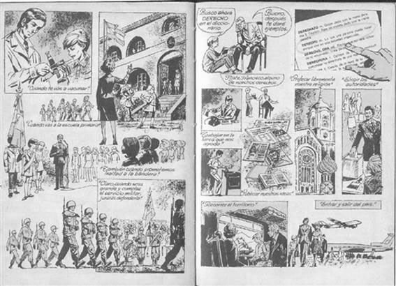 1 – La historieta como apelación. Uno de los primeros documentos del género que hallamos en nuestra consulta documental relevamos en libros de texto de la dictadura 1976-1983. La incorporación es rudimentaria en todos los aspectos referidos al lenguaje y cumple funciones claramente apelativas, reforzadoras de propósitos ejemplarizadores y belicistas (Carbone, 2006).
