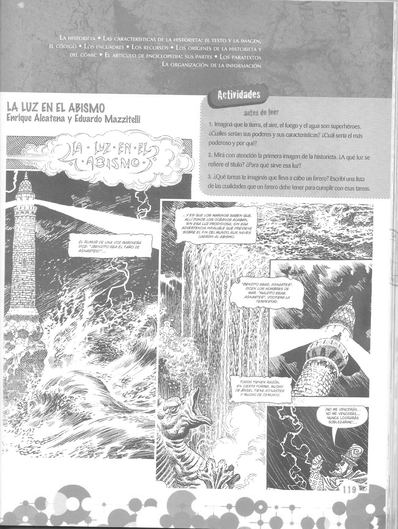 La sucesión de unidades retoma la historieta y sus incorporaciones como documentos y están complementadas con ejercicios breves y algunas conceptualizaciones que evidencian un plan de enseñanza del género que se extiende a lo largo del libro. Una culminación de ese tema se da en el capítulo dedicado a la narración. Las historietas incorporadas se vinculan entre sí como relatos y valorizan el género a través de sus cualidades y del autor elegido. Esta estrategia didáctica modera las intenciones centradas en lo procedimental tan frecuentes en las primeras etapas de enseñanza de estos textos (Aique, 1992:79).