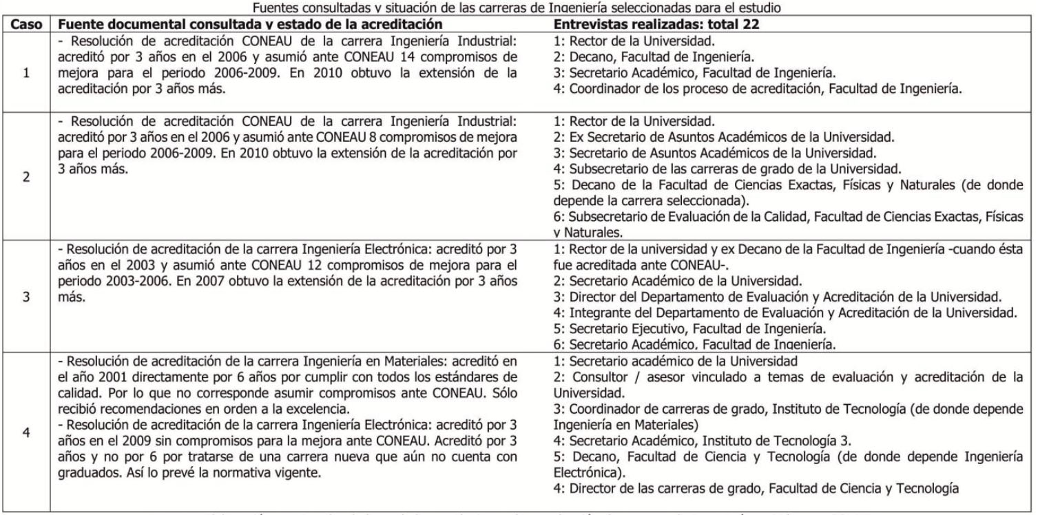 Las fuentes de información utilizadas para recopilar los datos fueron las resoluciones de acreditación CONEAU de las seis carreras de ingeniería pertenecientes a los cuatro casos seleccionados y las 22 entrevistas en profundidad realizadas a los rectores, decanos, secretarios académicos, directores de carreras y coordinadores de los procesos de acreditación (véase Tabla 2).
