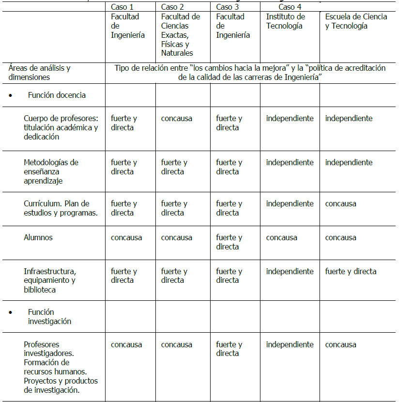 A modo de síntesis, del análisis documental y, principalmente, de las entrevistas, surgen tres tipos de relación entre los “cambios hacia la mejora realizados en las funciones de docencia e investigación” y los “procesos de acreditación de carreras de grado de ingeniería”: a) fuerte y directa; b) concausa; c) independencia. La relación “fuerte y directa” da cuenta de cambios que difícilmente hubiesen podido llevarse a cabo sin la mediación del proceso de acreditación. La relación denominada “concausa” conceptualiza aquellos cambios atribuidos a otros factores además del proceso de acreditación. Por último, se denomina relación de “independencia” a aquellos cambios detectados en los que el proceso de acreditación no tuvo influencia alguna (véase Tabla 4).