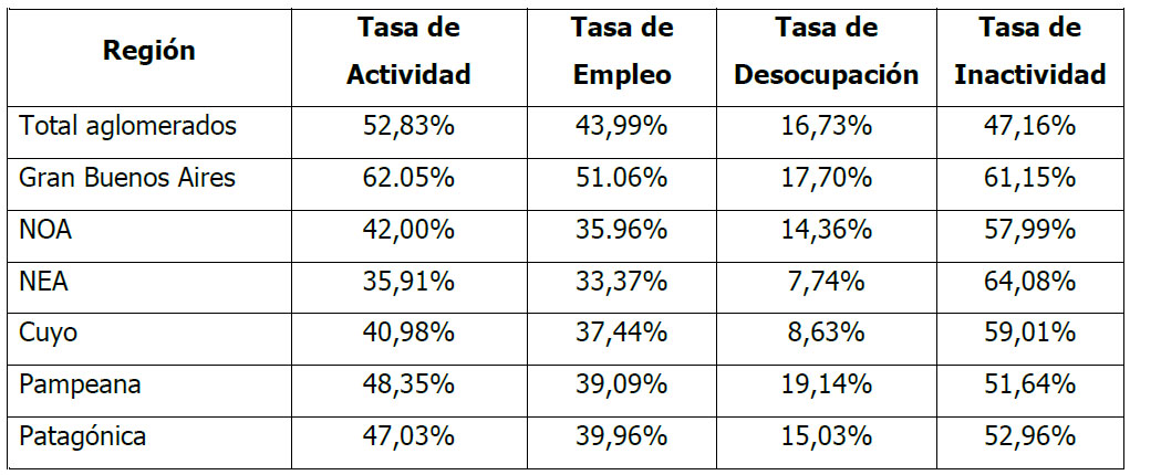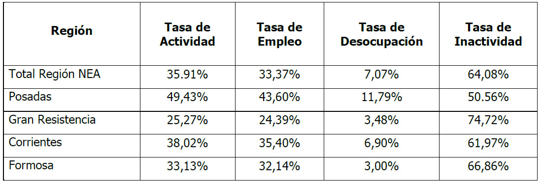Si bien a nivel país, en los jóvenes de la región NEA se encuentran los valores más bajos en todas las tasas del mercado laboral, el aglomerado de Gran Resistencia resulta ser el más crítico, a partir de mostrar las tasas de actividad (25,27%) y empleo (24,39%) más bajas de toda la región, junto con una tasa de desocupación también significativamente baja (3,48%) (Véase Tabla Nº 3).