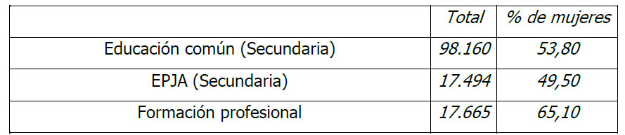 Corrientes, en cierta forma, es la que está en mejores condiciones en la región. Del grupo de adolescentes y jóvenes de bajos ingresos, los que sí estudian asisten, principalmente, a las ofertas de la modalidad EPJA (Educación Permanente para Jóvenes y Adultos). En la Tabla Nº 4 podemos observar la distribución de alumnos por sexo y por modalidad, tal cual lo presenta el Relevamiento Anual para la provincia de Corrientes. Si bien en porcentajes el número de estudiantes que asisten a la modalidad de EPJA no es significativo, sí lo es en números absolutos (17.494 estudiantes). También es posible observar que hay más mujeres que varones en la secundaria común (53,8%) y en Formación Profesional (65,1%).