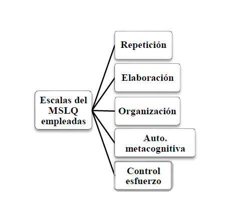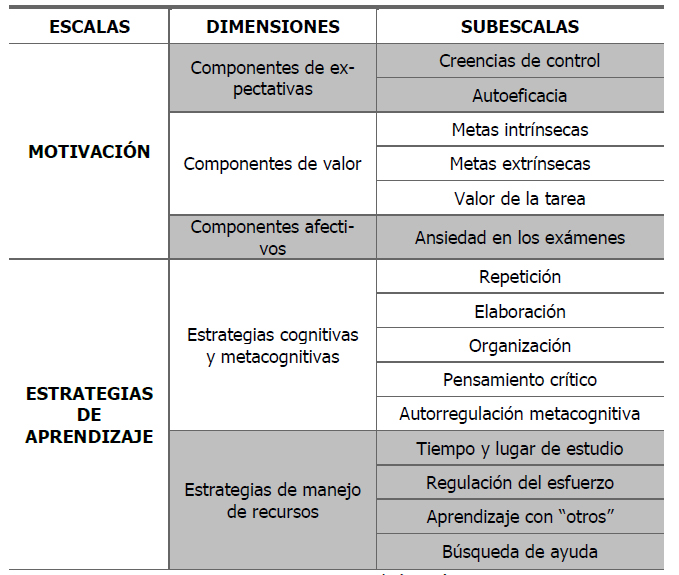 Se utilizó la versión del MSLQ recogida en un manual publicado en 1991 (Pintrich et al., 1991). Los 81 ítems de dicha versión se agrupan en seis subescalas motivacionales (31 ítems) y en nueve de estrategias de aprendizaje (50 ítems), tal como se puede ver en la tabla 1: