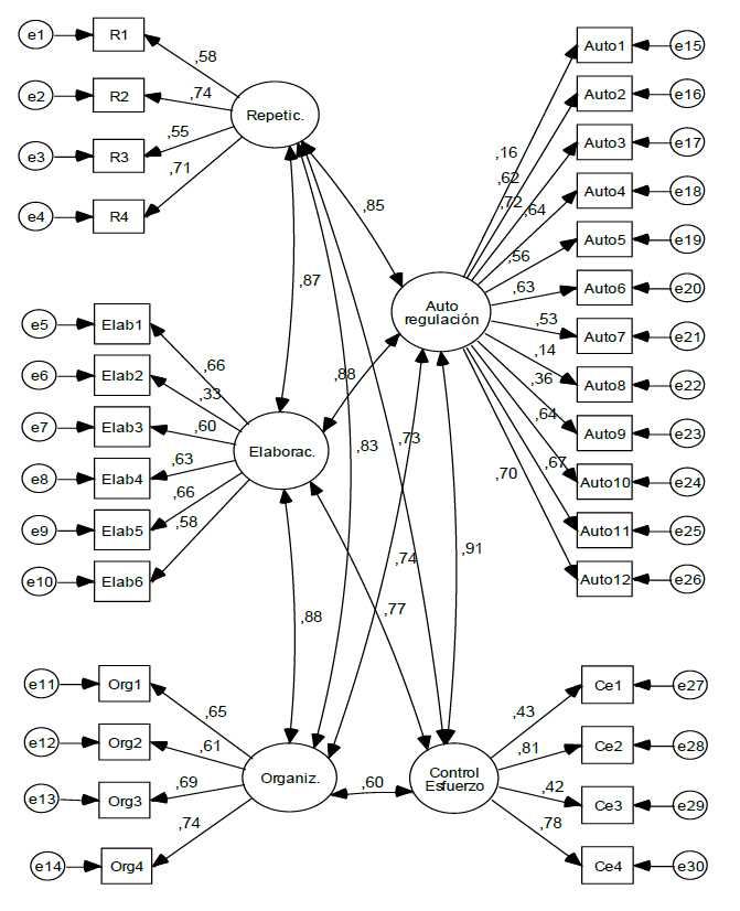 En este contexto, se probó un modelo de medida, con cinco factores de primer orden correlacionados entre sí. Cada uno de los cinco factores de primer orden está definido por cada una de las subescalas de estrategias de aprendizaje que se supone que mide el MSLQ, de acuerdo con el modelo teórico.