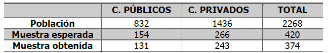 Según los datos proporcionados por el Departamento de Educación del Gobierno de Navarra (España) en el momento de realizarse el estudio, la población de referencia estaba constituida por 2268 estudiantes agrupados en 8 centros públicos y 20 privados (Veáse Tabla 2).