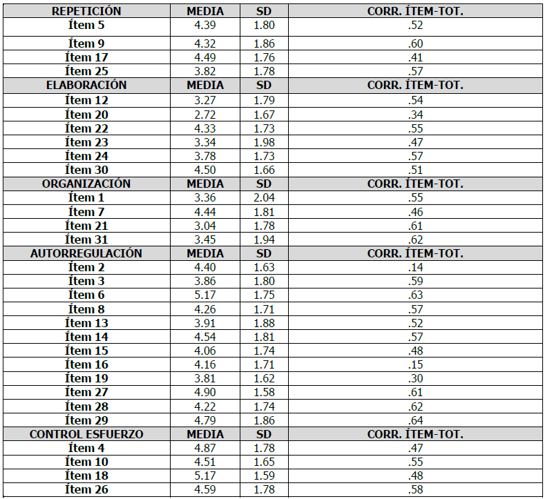Tal como se observa, en la escala de repetición los valores de las correlaciones van de moderadamente bajos a considerables, encontrándose entre .41 y .60. La correlación más baja dentro de esta escala la presenta el ítem 17 (“Memorizo palabras claves para recordar mejor las ideas importantes”).