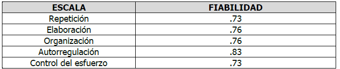 En cuanto a la fiabilidad, los coeficientes alfa de Cronbach son altos (entre .73 y .83), lo que muestra un elevado grado de consistencia interna para las subescalas seleccionadas en el ámbito de educación secundaria. No se comparan los valores obtenidos en nuestro estudio con los que se presentan en el manual del MSLQ, ya que éstos se obtuvieron con una muestra de alumnos universitarios. Sin embargo, hay que señalar que los valores que presentan Pintrich y DeGroot (1990) en un estudio realizado en secundaria son inferiores a los nuestros, mientras que en el de Karadeniz et al. (2008) se encontraron valores muy superiores.