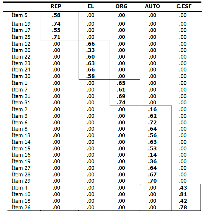 La primera aproximación al estudio de la dimensionalidad de las subescalas se llevó a cabo a través de un Análisis Factorial Exploratorio (AFE), realizando una rotación oblicua, con normalización de Kaiser y estimación iterativa de las comunalidades, estableciendo el valor de delta (grado de oblicuidad entre factores) en -2.0. Para ello, se utilizó el método Principal Axis Factoring (PAF), para llevar a cabo este análisis. A partir de las evidencias encontradas, y comprobando que, en general, todos los ítems saturaban más en el factor que les correspondía, se decidió continuar con el estudio realizando un Análisis Factorial Confirmatorio (AFC).