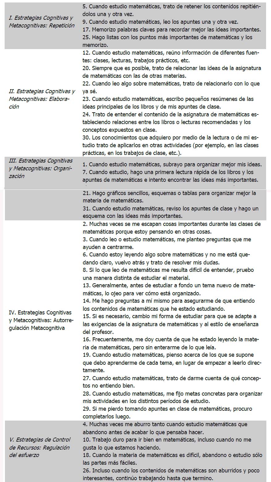 Autorregulación metacognitiva: alude a la planificación, control y regulación del aprendizaje. La planificación comprende el establecimiento de metas y el análisis de la tarea; el control hace referencia al mantenimiento de la atención mientras se lee, a la formulación de preguntas y a la autoevaluación; y la regulación hace referencia al ajuste continuo de las propias actividades cognitivas. Esta dimensión la conforman los ítems 2, 3, 6, 8, 13, 14, 15, 16, 19, 27, 28 y 29.