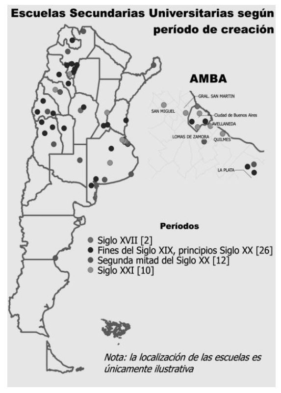 En el siguiente mapa podemos ubicar las secundarias universitarias estatales en el país considerando el momento histórico en que fueron creadas: