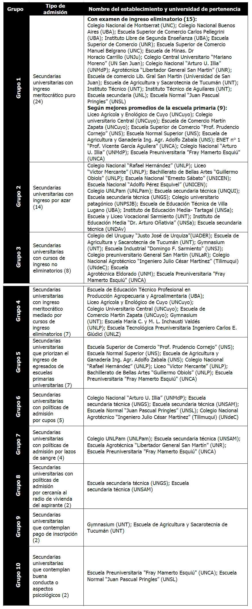 En el año 2017 son cincuenta y cinco las Universidades Nacionales y medio centenar las escuelas secundarias dependientes de universidades nacionales en Argentina. Éstas cuentan, a su vez, con historias diversas. A continuación pro-ponemos un agrupamiento según el momento de creación de los estable-cimientos, para abocarnos luego a una modelización de acuerdo a sus métodos de admisión.