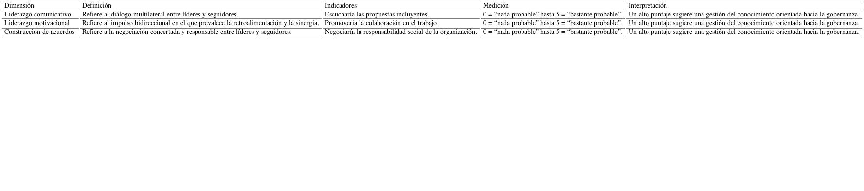 Se construyó la Escala de Gestión del Conocimiento EGC-21 el cual incluye 21 reactivos alusivos al liderazgo comunicativo, el liderazgo motivacional y la construcción de acuerdos entre líderes y talentos. Cada reactivo incluye las opciones de respuesta: 0 = nada probable, 1 = muy poco probable, 2 = poco probable, 3 = ni improbable ni probable, 4 = probable, 5 = muy probable (véase Tabla 2).