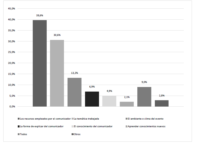 En esta categoría agrupamos aquellos aspectos valorados positivamente por los niños sobre la propuesta en la que participaron. Se destacaron en orden decreciente: los recursos empleados por el comunicador (39,6% - 57 niños), la temática trabajada (30,6% - 44 niños), el ambiente o clima del evento (13,2% - 19 niños), la forma de explicar del comunicador (6,9% - 10 niños), el conocimiento del comunicador (4,9% - 7 niños) y aprender conocimientos nuevos (2,1% - 3 niños). Asimismo, 13 niños (9%) escribieron “todo” sin especificar y 4 niños (2,8%) mencionan “compartir con los amigos” (Otros).