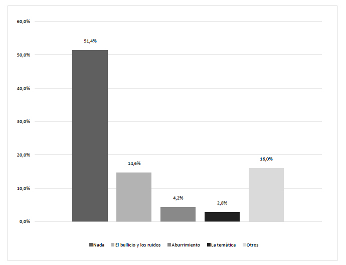 Aquellos que mencionaron aspectos a modificar, refieren a: el bullicio, los ruidos y esperar el turno para preguntar (14,6% - 22 niños), el aburrimiento (4,2% - 6 niños) y la temática (2,8% - 4 niños).