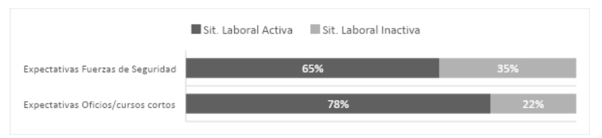 Tal como se anticipó anteriormente, en el presente estudio, la mayoría de las/los jóvenes que se inclinan por seguir alguna formación postsecundaria como oficios y/o cursos cortos se encuentran trabajando o en búsqueda, situación similar a la de aquellas/os que proyectan ingresar a las fuerzas de seguridad.