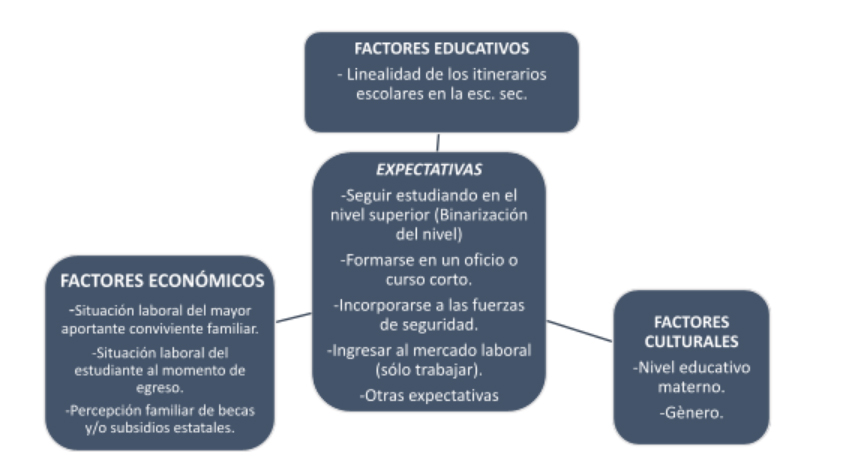 En el plano nacional, son numerosas las investigaciones socio-educativas que han indagado sobre el complejo vínculo entre las subjetividades juveniles, que egresan del nivel en cuestión, y sus expectativas de inserción laboral y/o educativa, vinculando el contenido de estas proyecciones a factores sociales condicionantes (Jacinto, 1996; Aisenson y Equipo, 2002; Miranda y Otero, 2005; Aisenson, Legaspi, Valenzuela, Duro, Celeiro, Inaebnit, De Marco, Pereda, 2009).