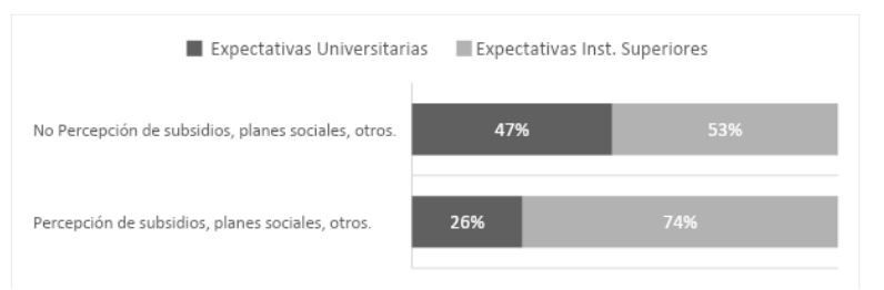 En lo que hace a esta binarización de expectativas dentro del nivel superior aparecen diferencias entre las distribuciones porcentuales de aquellas/os estudiantes pertenecientes a familias receptoras de subsidios con respecto a aquellos/as insertos en familias no receptoras.