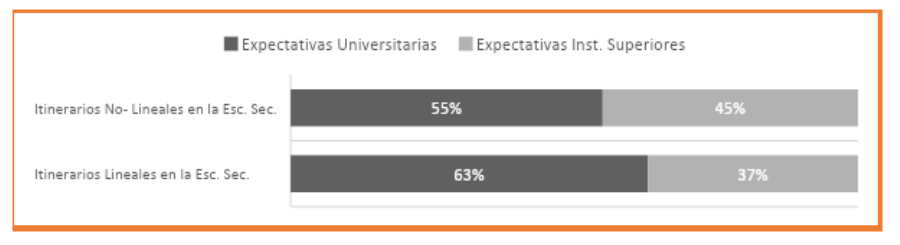 Ahora bien, si se ponen en relación las proyecciones hacia formatos educativos en universidades con la linealidad de los itinerarios, la diferencia porcentual es mayor siendo favorecidas las propuestas universitarias, elegidas por aquellas/os jóvenes que han transitado el nivel secundario en tiempo y forma.