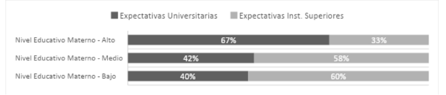 En el siguiente gráfico se puede observar cómo crece la tendencia hacia formatos universitarios al aumentar los niveles formales de educación de estas integrantes de la familia. Es así que se asevera que las proyecciones hacia la universidad se encuentran vinculadas mayoritariamente con niveles altos de escolarización maternos.