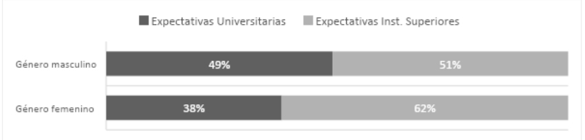 Si se tiene en cuenta el género auto percibido, las mujeres tienden a elegir propuestas de nivel superior en Institutos de Formación Docente locales. Casi el 60% de las mujeres que se dirigen al nivel opta por propuestas terciarias. Algunos autores/as han indagado sobre cuestiones de género en el nivel superior no universitario, abordando la feminización de la matrícula (Sigal y Dávila, 2005). Dicha tendencia se encuentra asociada a que la institución a la que más se dirigen estas expectativas se circunscribe al instituto de formación docente local, en tanto reservorio cultural de carreras históricamente vinculadas al género femenino (Tenti Fanfani, 2010). En el caso del género masculino, no se encuentran diferencias significativas con respecto a este tipo de proyecciones en el nivel superior.