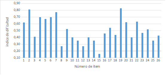 En la Figura 2 se proporcionan los índices de dificultad de los ítems del cuestionario. Puede verse en ella que los ítems que tienen un índice de dificultad por debajo de 0.4 (esto es, han respondido acertadamente menos de 40% de los estudiantes y, por tanto, pueden considerarse los más difíciles) son: ítem 8 (i.d. =0.27), ítem 11 (i.d.=0.35), ítem 12 (i.d. =0.27), ítem 14 (i.d. =0.35), ítem 15 (i.d.= 0.16), e ítem 25 (i.d.=0.35). En el Anexo 1 se muestran dichos ítems.