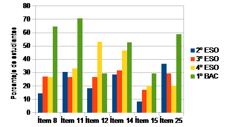 El porcentaje de estudiantes que han elegido la respuesta correcta en estos ítems más difíciles en función de su nivel académico viene recogido en la siguiente representación gráfica (Figura 3).